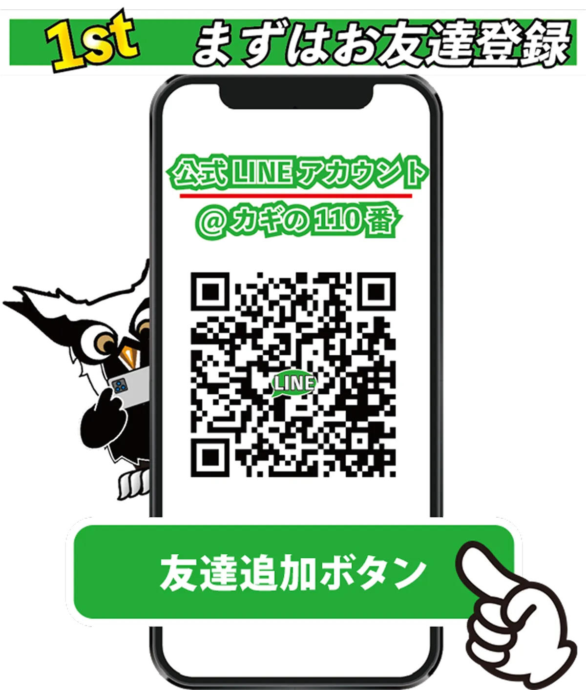 LINEの「友達追加」画面にて「QRコード」を開き上記QRコードを読み取るか、「検索」を開きID検索で【@361nkbfv】と入力してカギの110番をお友達登録いただきます。